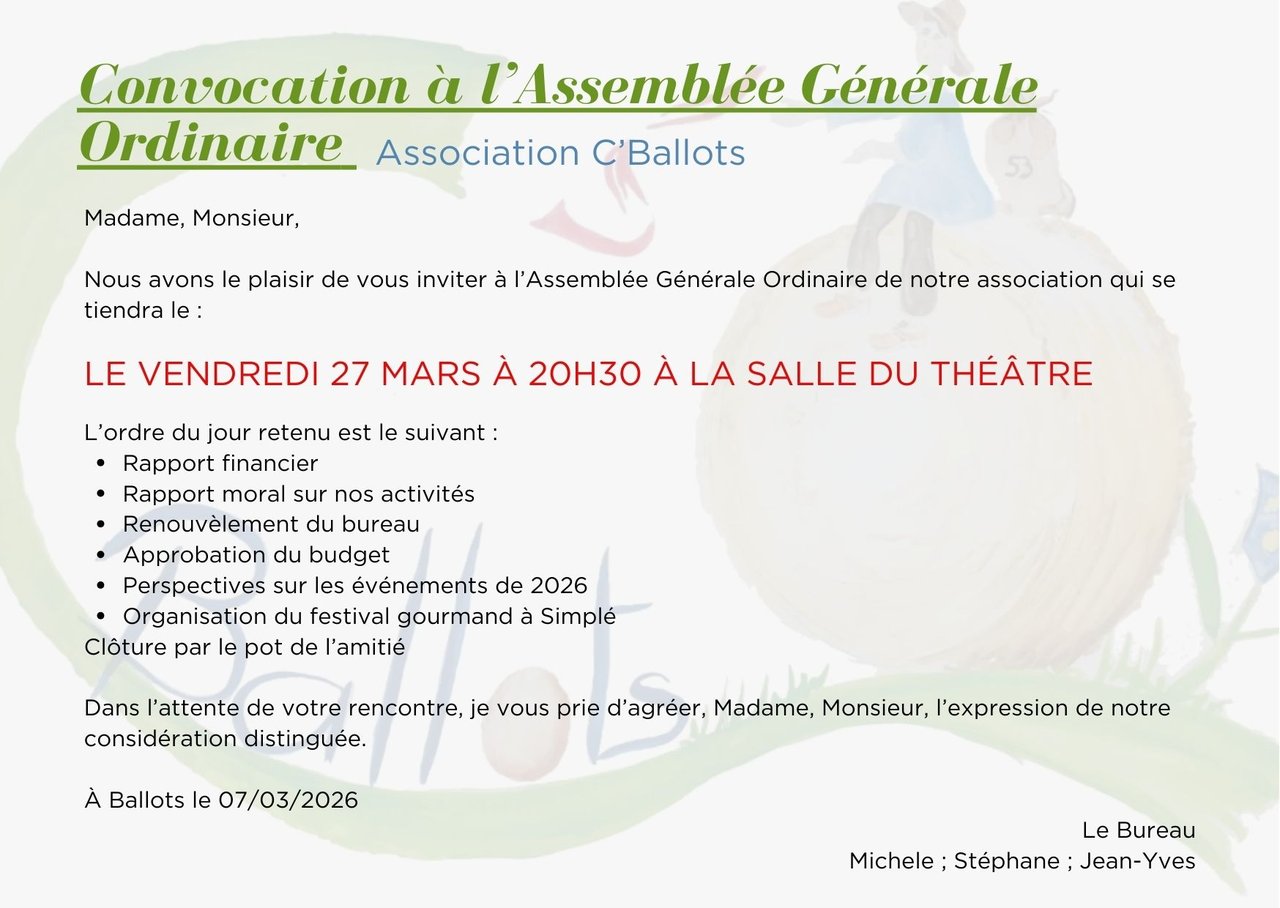 Nous avons le plaisir de vous inviter à notre Assemblée Générale Ordinaire qui se tiendra le vendredi 27 mars à 20h30 dans la salle de théâtre de Ballots.
