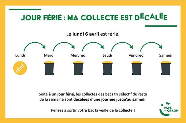 Le Lundi 6 Avril 2026 étant férié, la collecte des déchets recyclables (bac à couvercle jaune) en semaine impaire (n°15) - sera décalée d’une journée jusqu’au samedi.