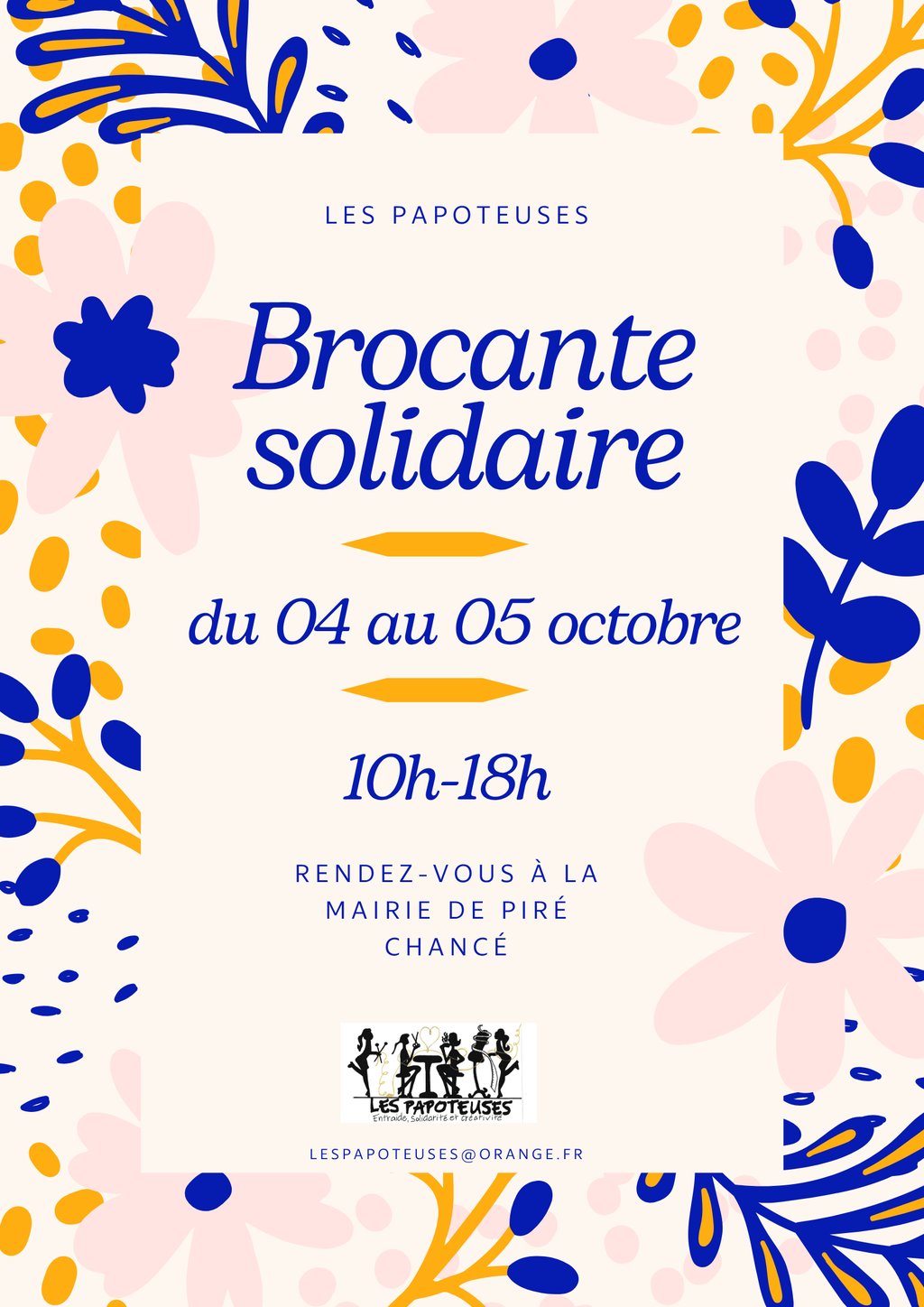 Pour la 6ème année, l'association "les papoteuses" organise la brocante solidaire les 04 et 05 octobre 2025 de 10H-18H à la mairie de Piré-Chancé.