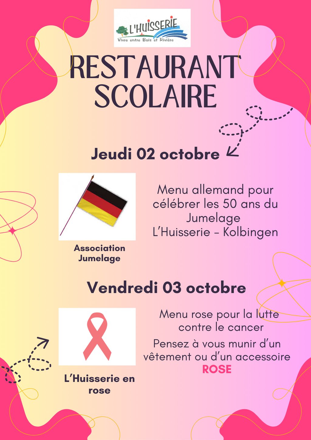 Votre restaurant scolaire se mettra aux couleurs de l'Allemagne le jeudi 02 octobre et au Rose le vendredi 03 octobre.