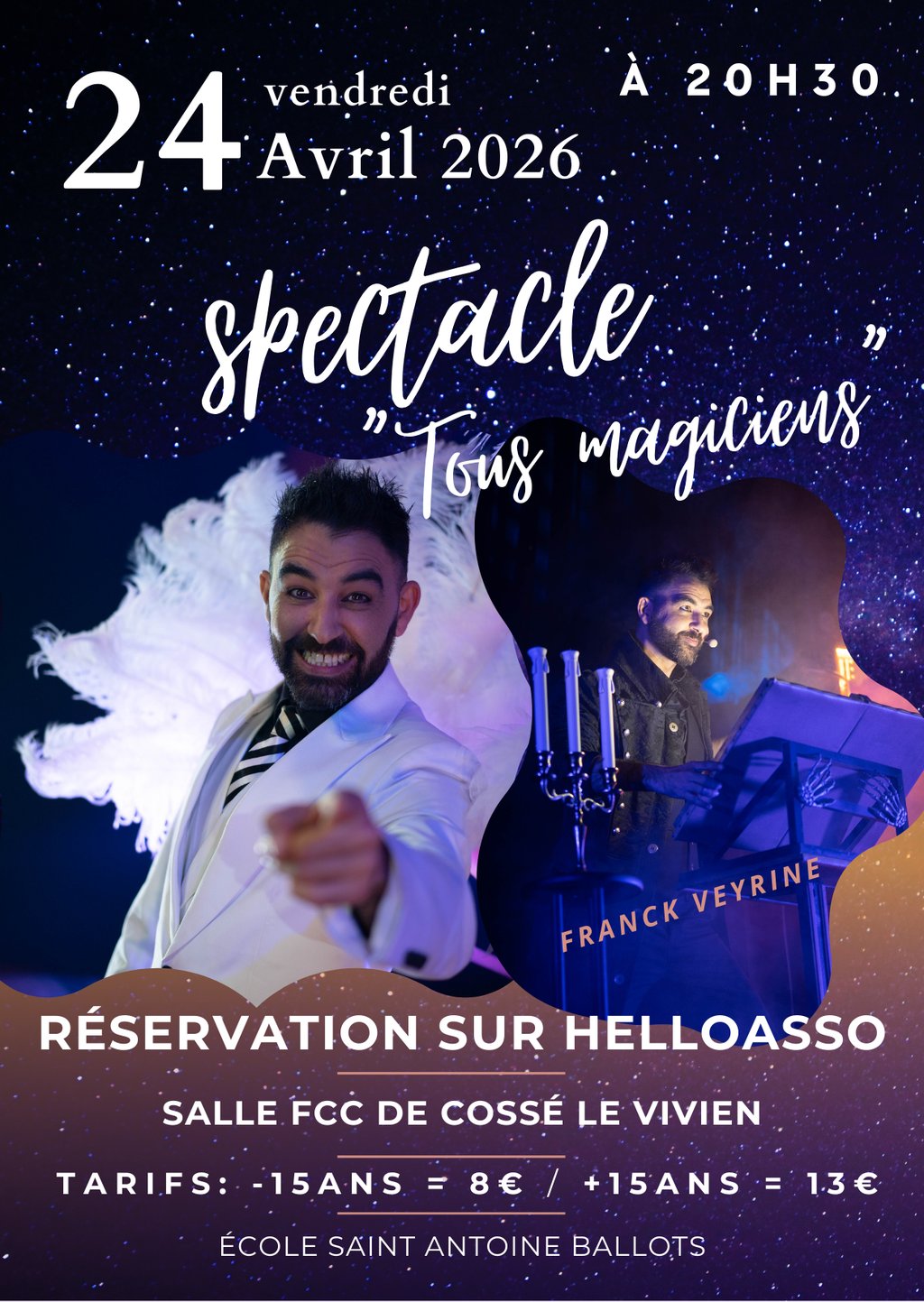 Spectacle de magie "Tous magiciens", le vendredi 24 avril 2026 à 20 h 30 à la salle du F.C.C de Cossé le Vivien.
